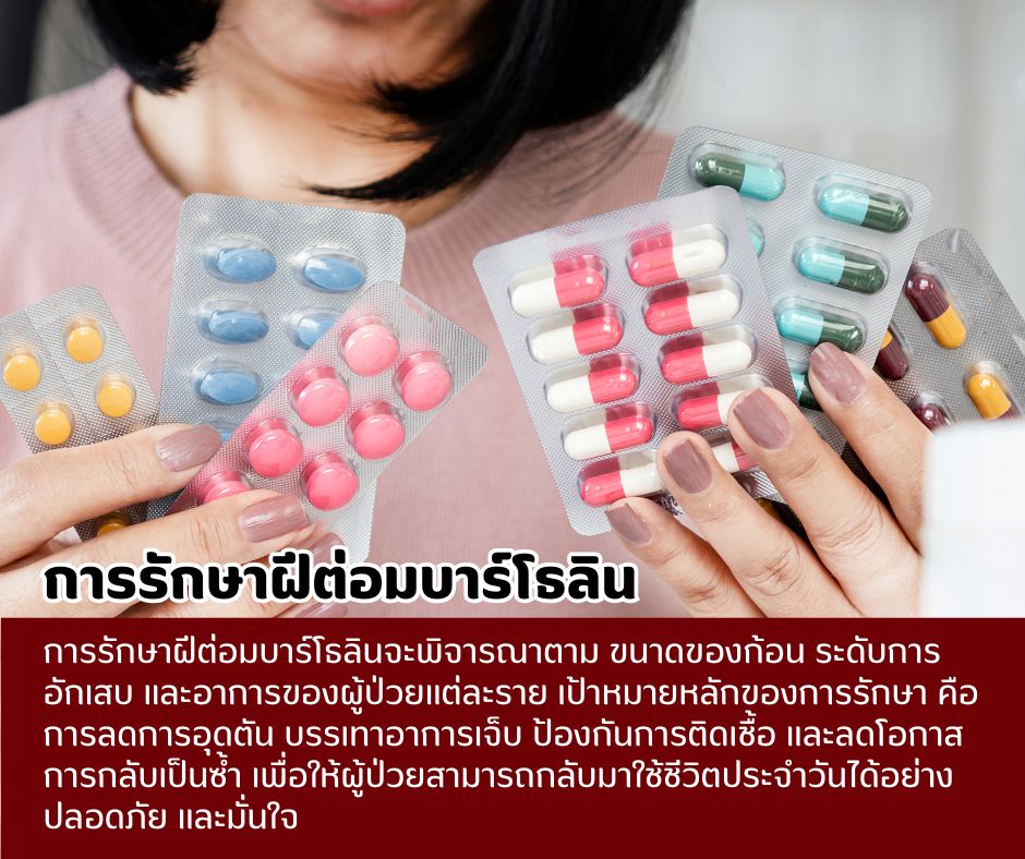 การรักษาฝีต่อมบาร์โธลินจะพิจารณาตาม ขนาดของก้อน ระดับการอักเสบ และอาการของผู้ป่วยแต่ละราย เป้าหมายหลักของการรักษาคือการลดการอุดตัน บรรเทาอาการเจ็บ ป้องกันการติดเชื้อ และลดโอกาสการกลับเป็นซ้ำ เพื่อให้ผู้ป่วยสามารถกลับมาใช้ชีวิตประจำวันได้อย่างปลอดภัย และมั่นใจ