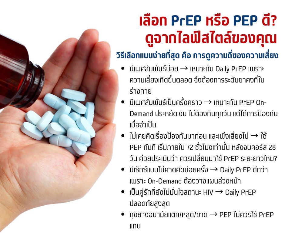 - ไม่เคยคิดเรื่องป้องกันมาก่อน และเพิ่งเสี่ยงไป → ใช้ PEP ทันที เริ่มภายใน 72 ชั่วโมงเท่านั้น หลังจบคอร์ส 28 วัน ค่อยประเมินว่า ควรเปลี่ยนมาใช้ PrEP ระยะยาวไหม?